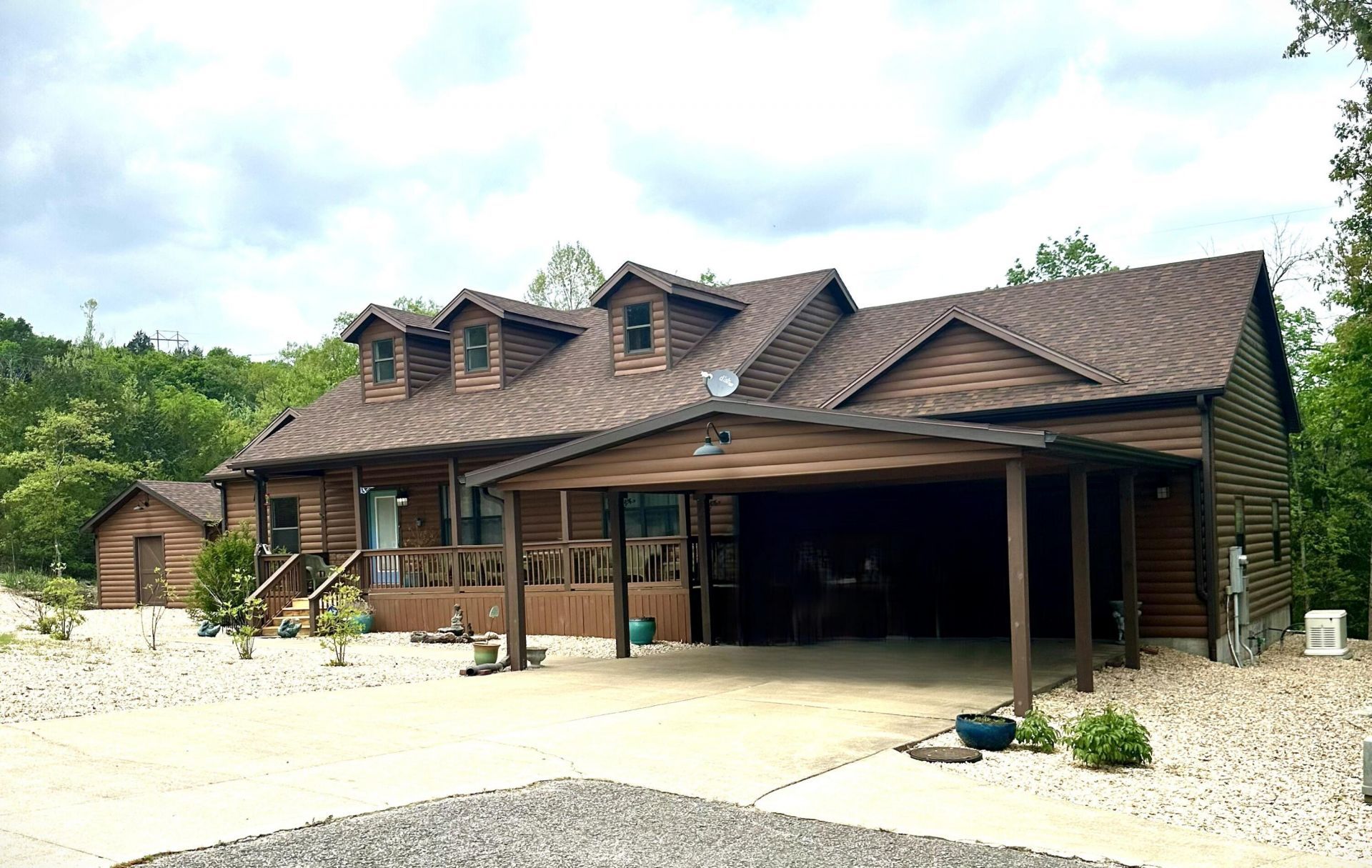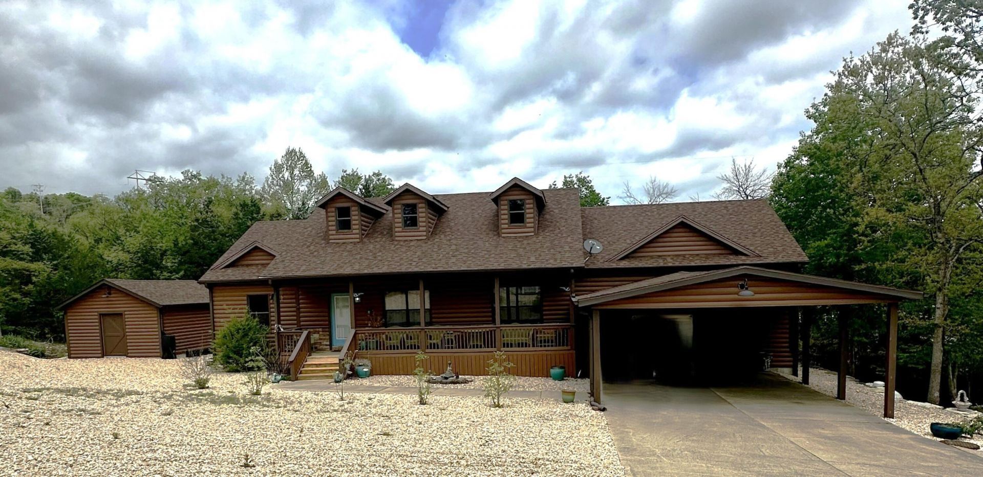 Charming 3BR/2BA home with log siding and vaulted ceilings, offering a warm, rustic feel with modern updates. Features include new solid oak doors, 6'' oak trim throughout, and durable LVP flooring. Cozy living room with fireplace.Exterior highlights include a carport, attached oversized 2-car garage 30 deep and 26, wide. Also, a detached shed 16 by 20 for additional storage. Situated on nearly 1 acre with a low-maintenance gravel yard and attractive landscaping.Enjoy outdoor living with a large covered front porch and spacious back deck--perfect for relaxing or entertaining.
