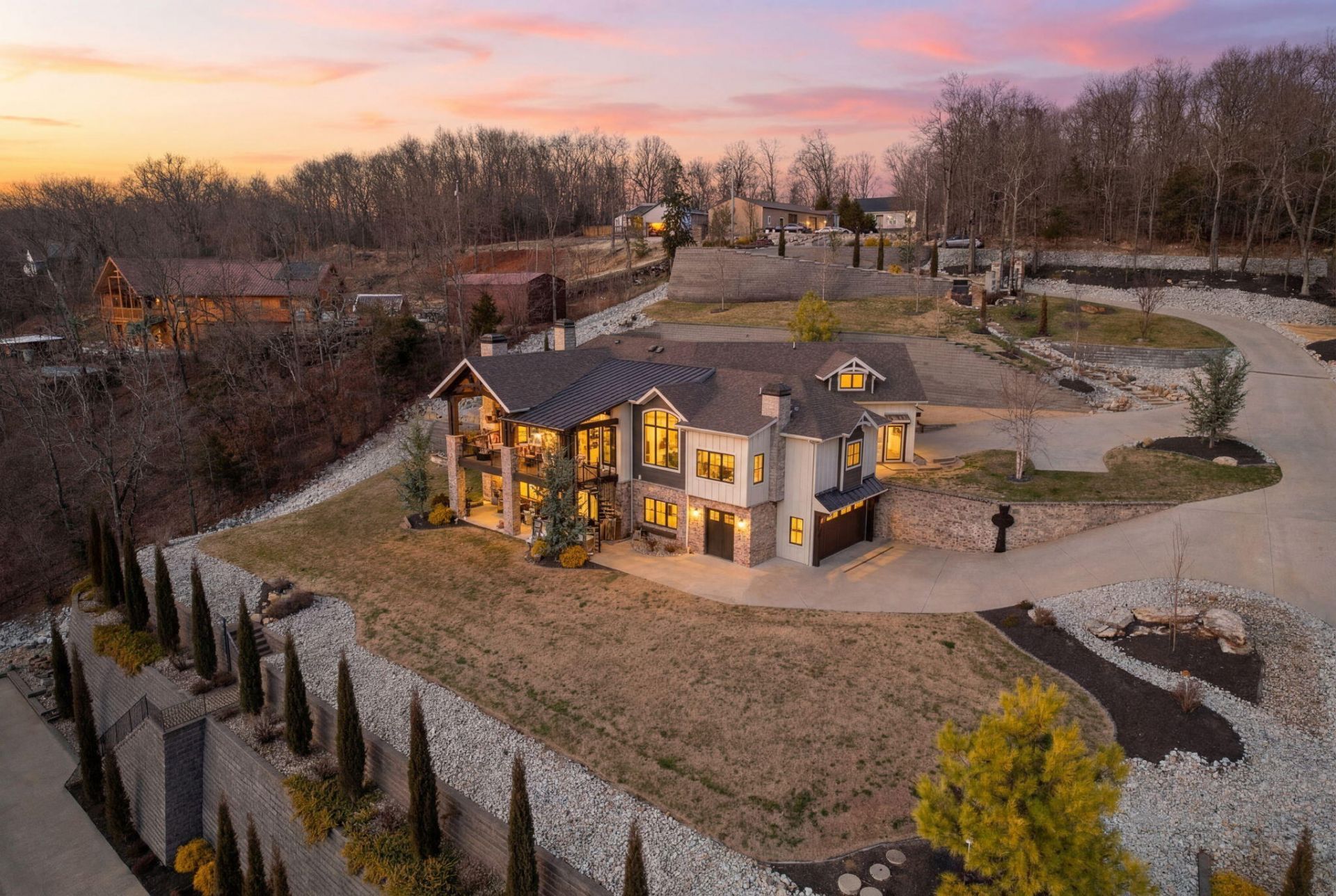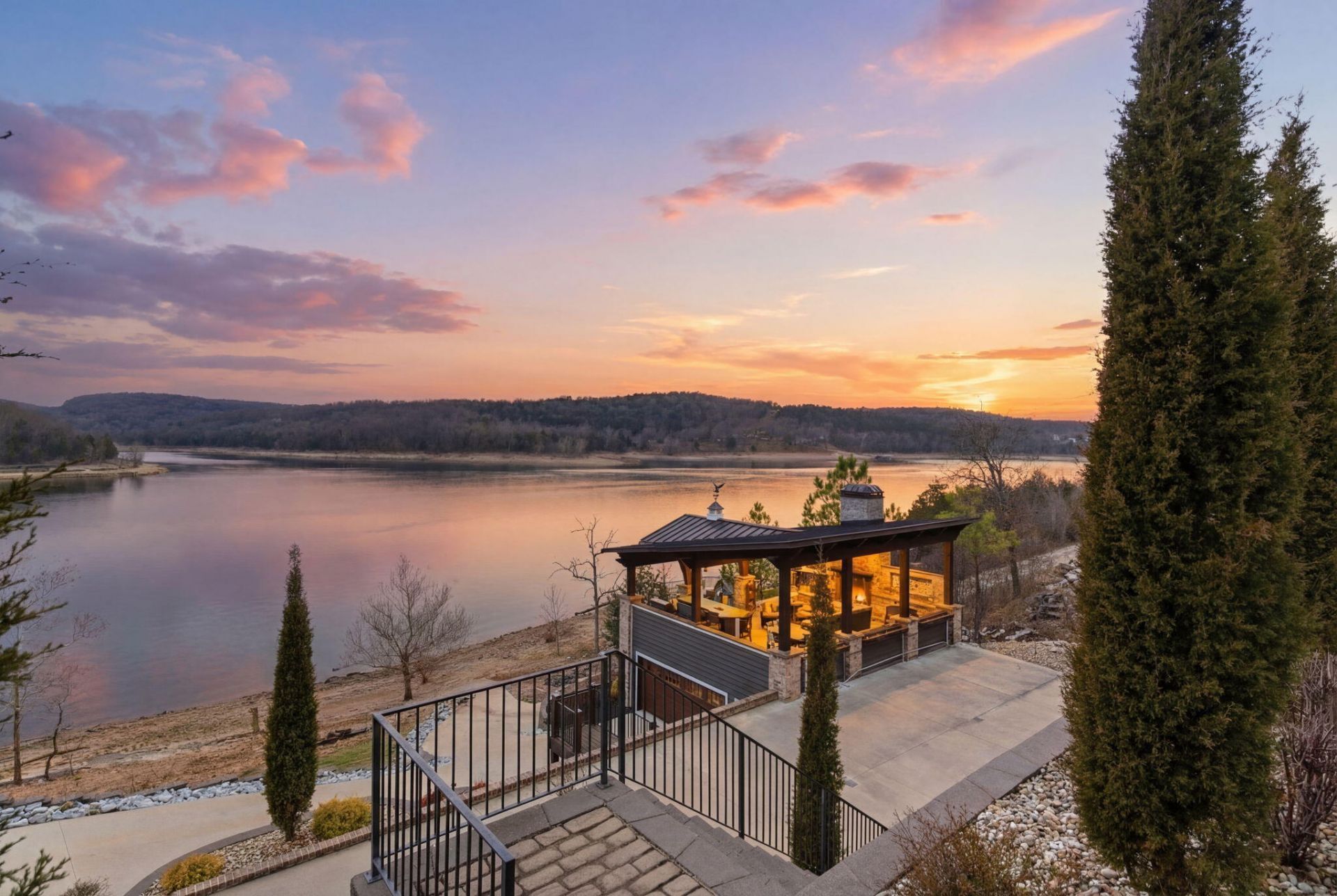 Custom built in 2020, this extraordinary gated lakefront estate is one of the most iconic residences on Table Rock Lake. Set on just under 2 private acres moments from Big Cedar Lodge, this architectural showpiece is defined by its structural timber frame core construction, blending master craftsmanship with enduring design. The main level is designed to capture breathtaking lake views from nearly every vantage point. The expansive primary suite features a sitting room with a fireplace, a spa-inspired bath, and large walk-in closet, while two additional bedrooms and a full bath provide comfort for guests across the home. The stunning kitchen is complete with premium finishes, custom cabinetry, large island, walk-in pantry, and a plumbed built-in coffee system. The lower level is equally impressive, offering a spacious living area, full wet-bar kitchen, dedicated man cave, full bath, private bedroom, a fully functioning woodshop, and extended garage space. Thoughtful additions such as a built-in dog bed and dog wash station further elevate everyday living. Indoor and outdoor living blend seamlessly with accordion doors opening from the living room to an expansive deck. The outdoor space is designed for entertaining at scale, featuring a separate waterfront pavilion with grill, sink, and refrigerators, along with fully irrigated grounds and multiple gathering areas. Five fireplaces throughout the property--including two exterior full masonry wood-burning fireplaces, create warmth and ambiance year-round. Smart-home technology controls lighting, climate, security, and garage access. Mechanical excellence includes high-efficiency VRF heating and cooling systems that allow for low cost utilities. With garage capacity for approximately 6-8 vehicles, a private boat slip, and an unmatched lakefront setting, this is a rare opportunity to own a true legacy-caliber estate.
