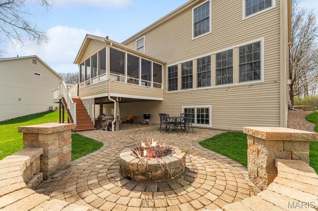 Beautifully designed and thoughtfully upgraded, this impressive two-story home in O'Fallon offers approximately 3,716 sq. ft. of living space across the first and second levels. The main level showcases 9-foot extended ceilings, a formal dining room, and a home office or formal living room with French door entry. The family room is highlighted by a wall of windows overlooking the wooded backyard and features built-in bookcases flanking the gas fireplace.The expansive kitchen is the heart of the home, featuring custom cabinetry, granite countertops, real hardwood floors, and a large center island with breakfast bar seating. The breakfast area provides a space for casual dining and offers access to a covered, screened-in deck. This seamlessly opens to a maintenance-free deck featuring steps down to the backyard. A butler's pantry and a walk-in pantry add both style and functionality to the kitchen, offering additional storage and serving space-perfect for hosting gatherings. A half bath, a drop zone with open lockers, an oversized laundry room, and a 3-car garage complete the main level.Upstairs, the massive primary suite serves as a luxurious retreat, highlighted by vaulted ceilings, an oversized 11x14 walk-in closet, and a spacious private bath complete with a double vanity, corner soaking tub, and glass-surround shower. 3 generously sized guest bedrooms are also located on this level, including 2 that share a convenient Jack-and-Jill bathroom (each with own vanity and toilet). The 3rd bedroom is a junior suite with its own private bath, and all three secondary bedrooms feature walk-in closets. The second level also boasts a massive loft / family room area and a dedicated HVAC system.The lower level expands the home's future square footage potential with a full, unfinished lookout basement all with 9ft extended ceilings. It is just waiting for your personal touch to add a 5th bedroom, full bath, and a large family room, while still leaving plenty of unfinished storage space.Additional highlights include dual HVAC for enhanced comfort and efficiency, an irrigation system, and a new roof installed in 2025. Outside, the professionally landscaped yard and paver patio-featuring a firepit with built-in seating-are perfect for outdoor entertaining or relaxing evenings. The $775/year HOA amenities include walking trails, a playground, and a community pool.