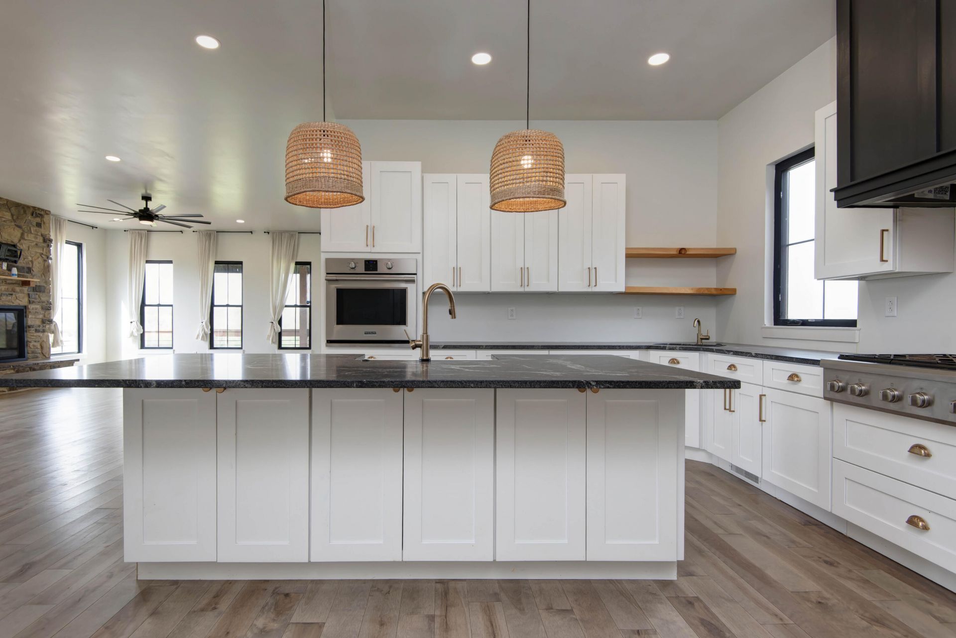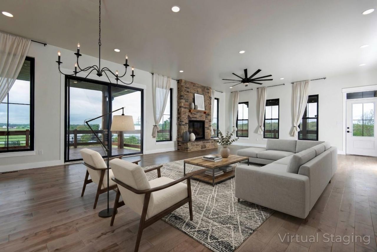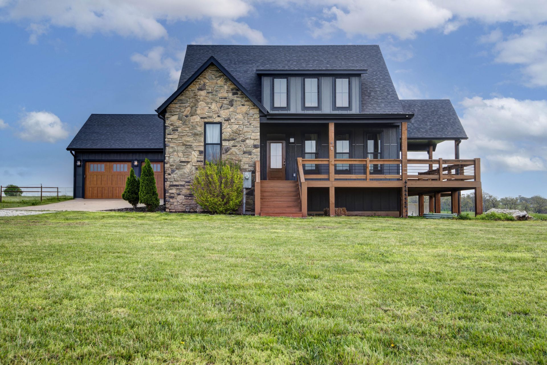 Set on Tennessee Road in Ozark, this stunning modern farmhouse brings together bold design, wide-open views, and that easy country feel so many people are after. The stone and dark exterior make such a striking first impression, while the wraparound deck is made for slow mornings, sunset skies, and soaking in all the fresh Ozark air. Inside, natural light pours in through Anderson windows throughout and highlights a bright, open living space with HIGH ceilings, beautiful maple wood floors, and a gorgeous stone fireplace that anchors the room. The kitchen is sleek and elevated with a gas cooktop, matte granite countertops, and warm gold accents that give the whole space a custom feel. Even the laundry room was thoughtfully designed with a soapstone top that adds another layer of style and function. The primary suite is a standout with a walk-in shower, dual vanities, and a spacious closet that feels every bit as polished as the rest of the home. Downstairs, the full basement adds even more room with two bedrooms and a full bath, giving you flexibility for guests, hobbies, or extra living space. Outside on the 5 acres enjoy the sounds of nature. Out far enough to enjoy the breathing room but still close to everything Ozark has to offer, this home is the perfect mix of modern farmhouse style and peaceful country living.