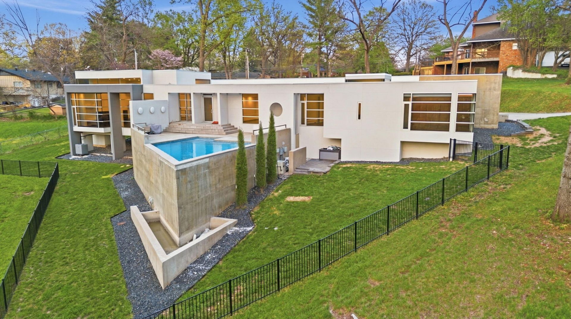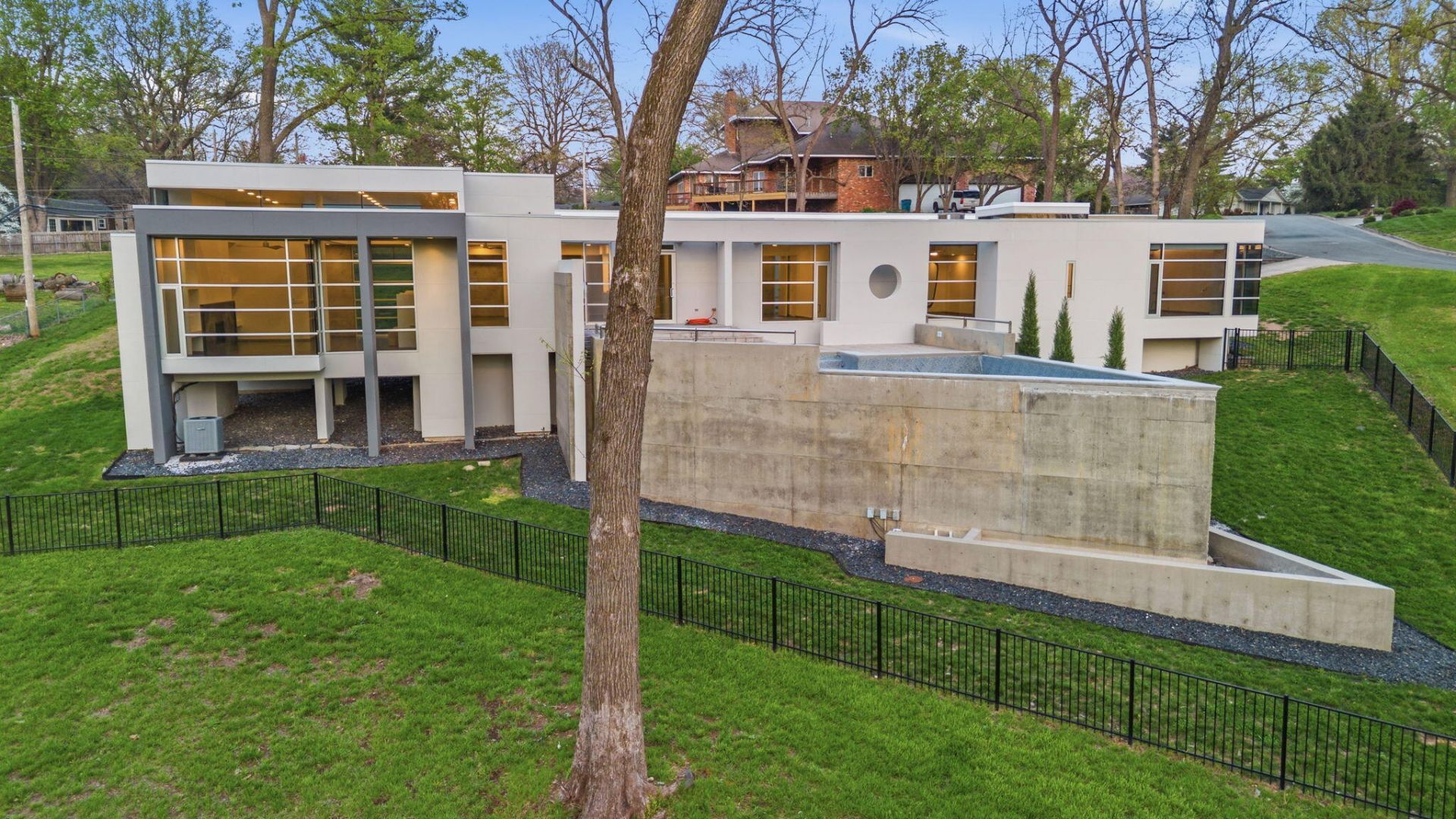 Unique modern contemporary residence in Southern Hills designed by local architect Dennis Spencer. This one-of-a-kind concrete and glass home sits on a private 1.24-acre cul-de-sac lot in one of the city's most sought-after neighborhoods. Designed to blur the line between indoor and outdoor living, the home features expansive walls of glass, abundant natural light, and curated sightlines that frame the surrounding landscape, creating a private architectural retreat that is both dramatic and serene. Significant exterior investments include full stucco replacement, a 20-year roof membrane, and professionally sealed hardscapes for long-term durability and low maintenance. Inside, extensive upgrades elevate both design and function. A dramatic Machino's gas fireplace with integrated heat-wall design anchors the main living space, complemented by a fully redesigned black Python granite surround from Unique Tile and custom built-in shelving. Throughout the home, refinished concrete floors, Sherwin-Williams Emerald paint, new metallic baseboards, and a Lighthouse Gallery lighting package create a cohesive modern finish. The kitchen features a Bosch 36-inch cooktop and Fisher & Paykel dishwasher drawer, blending performance with clean design. Major mechanical upgrades include a high-efficiency high-velocity HVAC system with all new ductwork, polarized media air filtration, wireless multi-zone climate control, and comprehensive boiler system upgrades. A whole-home water system includes multi-stage filtration, UV purification, water softening, and a new water heater, reflecting a substantial investment in long-term comfort and efficiency. Outdoor living has been thoughtfully simplified and refined. Landscaping improvements open sightlines and enhance privacy while maintaining a natural setting. The former pool area has been reimagined as a clean poured concrete patio, creating a low-maintenance outdoor living space that complements the home's modern architecture. Additional upgrades include full window sealing, a new side entry door, and ongoing system improvements completed throughout ownership, along with prior restoration work that strengthened the home's overall integrity. A rare opportunity in Southern Hills, this residence offers architectural significance, privacy, and extensive system investment--delivering a refined modern lifestyle in a truly one-of-a-kind setting.