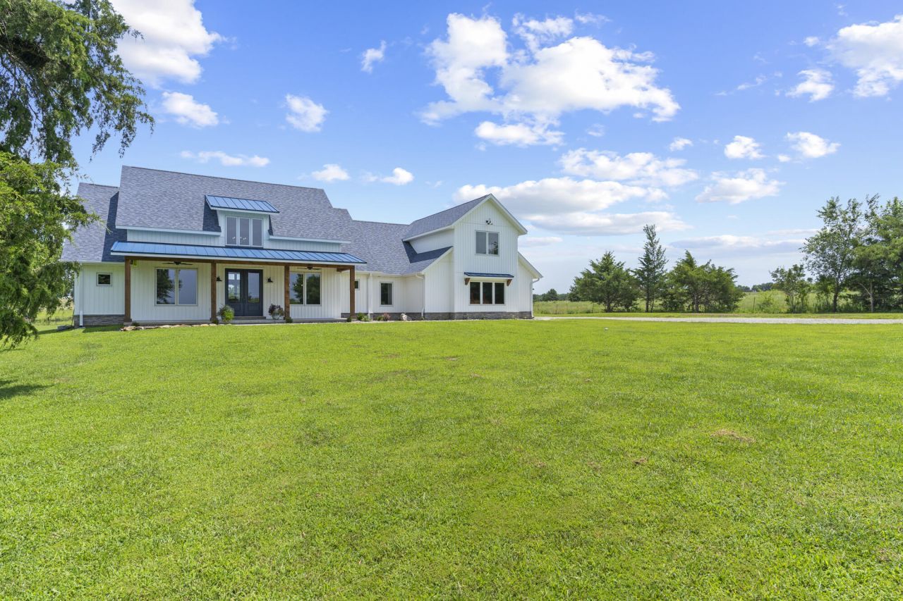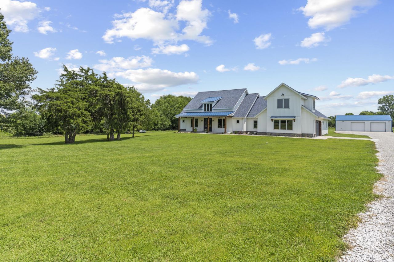 Built in 2022, this custom farmhouse-style home sits on 18 beautiful acres just outside Ash Grove and a short drive to Springfield, offering the perfect blend of modern comfort and peaceful country living. Step inside and you'll immediately appreciate the light filled open floor plan, highlighted by soaring beamed ceilings, hardwood flooring, expansive windows and striking stone gas fireplace. The kitchen was designed with both entertaining and everyday living in mind, featuring a large island, double ovens, abundant cabinetry and a walk-in pantry. The main level includes 3 bedrooms, which includes the primary suite with an oversized walk-in closet, soaking tub and large walk-in shower. Upstairs is a bonus room that works as a 4th bedroom, office or hobby space. Enjoy the tranquility of the countryside from the covered back patio or take in the spectaular sunsets from the welcoming front porch. The 18 fenced acres provide endless possibilities for livestock, recreation or simply enjoying wide open spaces. A 30x49 insulated outbuilding with electricity adds valuable flexibility for a workshop, equipment storage or hobby building. If you're searching for a newer custom home on acreage, this exceptional property delivers.