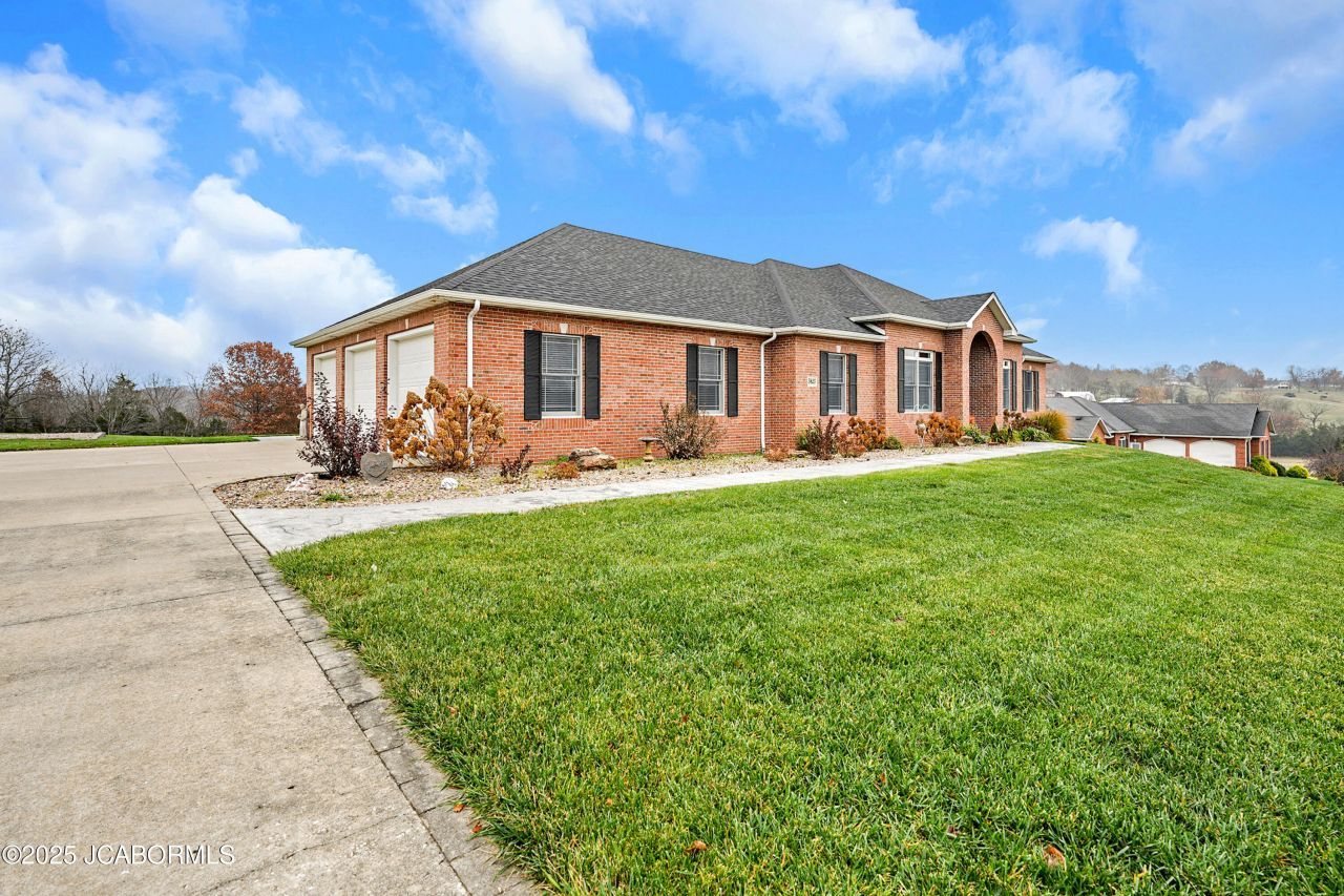 Discover a residence where modern luxury meets exceptional design in the prestigious Blair Oaks School District. From the moment you step through the stunning front door, this professionally crafted home reveals a sophisticated, light-filled interior, perfect for elevated living. This home has been updated with a brand new roof, oversized gutters and downspouts, new high efficiency furnace and air conditioner, newer professionally installed water softener & water heater, rain bird water sprinkler system and sleek epoxy floors throughout the main level 3 car garage. The main level flows effortlessly with expansive windows, clean architectural lines, and a beautifully integrated open layout. A sleek gas fireplace anchors the living space, enhanced by whole-home surround sound and seamless access to the outdoors through French patio doors. Step onto the impressive 47' x 13' stamped concrete, covered back patio, an extended living space designed for quiet mornings, sunset dining, and unforgettable gatherings. Enjoy the sights and sounds of nature as it passes through your private back yard.The luxurious primary suite offers a serene retreat with a spa-caliber bath, featuring a deep jetted soaking tub, dual granite vanities with oversized mirrors, a glass and tile walk-in shower, and an oversized walk in closet. The kitchen is sure to please with designer granite countertops, expansive pantry spaces and sleek new appliances!With 3 bedrooms, 3 full baths, and two additional lower-level rooms (non-conforming bedroom spaces), this home offers unparalleled versatility--ideal for guest suites, creative studios, home gym space, or private workspaces.The lower level is a destination of its own: an expansive 40' x 20' entertainment lounge designed for hosting on a grand scale. The striking acid-stained concrete floors, full wet bar with signature swing seating, and generous space for gaming, media, and conversation create an atmosphere that is both stylish and unforgettable.A rare luxury, the lower level also features a massive 42' x 14' heated garage/storage bay with an automatic door--offering exceptional space for a boat, collector vehicles, or an elevated workshop. There is added protection from any storm in a 5x7 concrete shelter complete with door. This home is wired for a whole home generator with a designated breaker for the generator, and is rough plumbed for a whole home central vac system. Every detail has been thoughtfully crafted to deliver a modern, refined living experience. Homes of thi