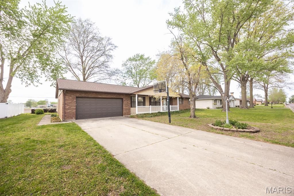 Prime Mascoutah location! This well-maintained, all-brick ranch offers space, character, and convenience in one inviting package. The home features a comfortable living room and dining room, ideal for everyday living or entertaining. The large eat-in kitchen provides ample cabinet space along with extra storage, making meal prep and organization easy. A spacious family room adds flexibility for relaxing, gatherings, or hobbies. Enjoy the impressive 2002 addition showcasing a vaulted, beamed ceiling and a cozy wood-burning fireplace-perfect for cooler evenings or hosting guests. An oversized 2-car garage offers plenty of room for vehicles, storage, or a workshop. The home has passed the city occupancy inspection, providing added peace of mind for the next owner. Conveniently located close to schools, parks, and Scott AFB, this solid ranch combines a desirable location with timeless brick construction and generous living areas. A wonderful opportunity to make this Mascoutah home your own. Buyers to verify all information.